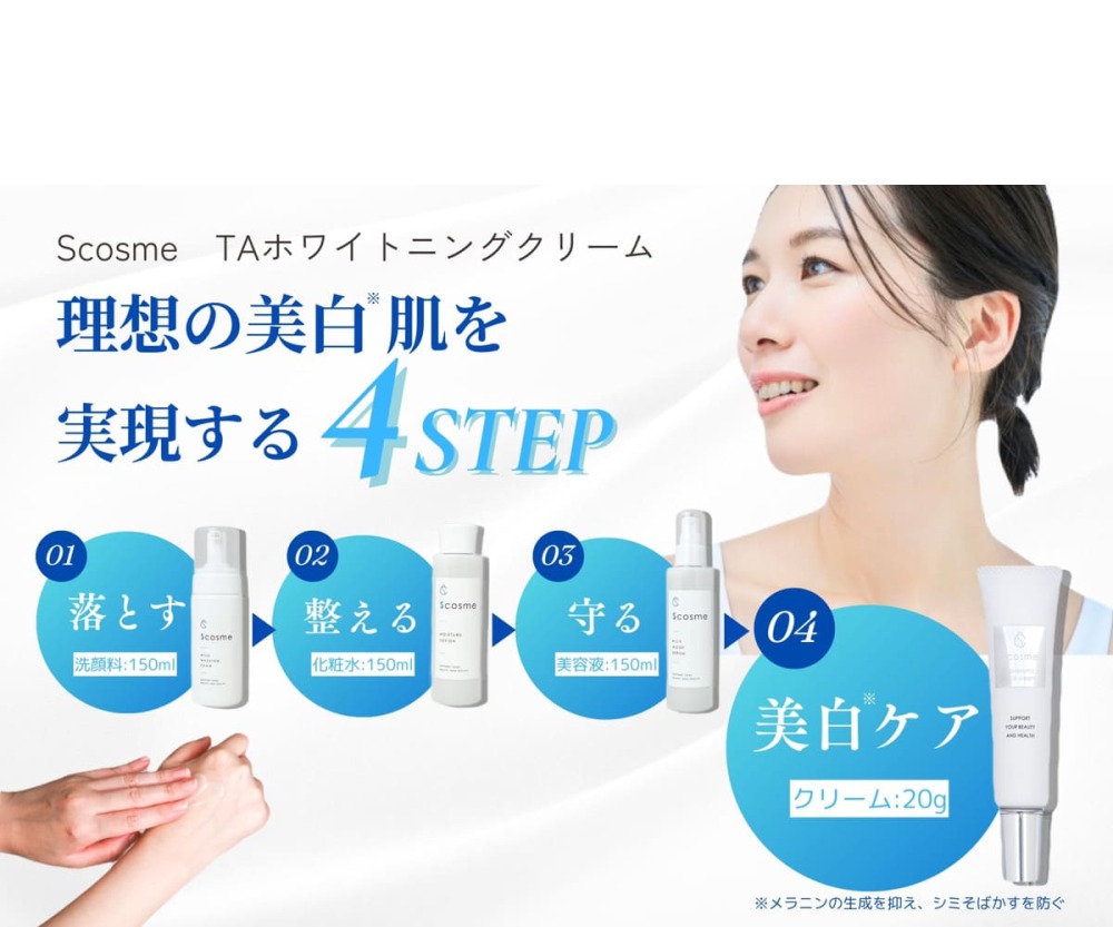 ②TAホワイトニングクリームを適量手にとる。顔全体に対し、7mm程度のパール粒大が適量です。